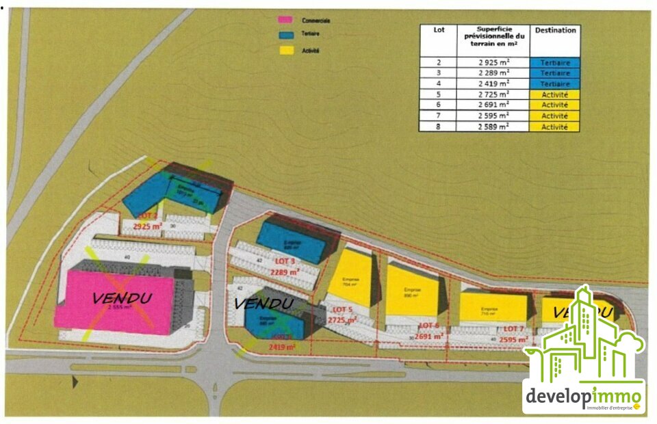 – Lot 2 : 2 925 m² à vocation de bureaux ou commerciale. – Lot 3 : 2 289 m² à vocation de bureaux ou commerciale. – Lot 5 : 2 725 m² à vocation commerciale. – Lot 6 : 2 691 m² à vocation commerciale. – Lot 7 : 2 595 m² à vocation commerciale.